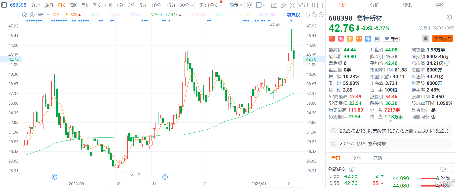 格隆汇2月6日丨赛特新材跌近6%,报42.76元,总市值34亿元。赛特新材发布首次公开发行部分限售股上市流通公告,此次上市流通的限售股数量为4330万股,占公司总股本的54.125%;此次上市流通日期为2023年2月13日。