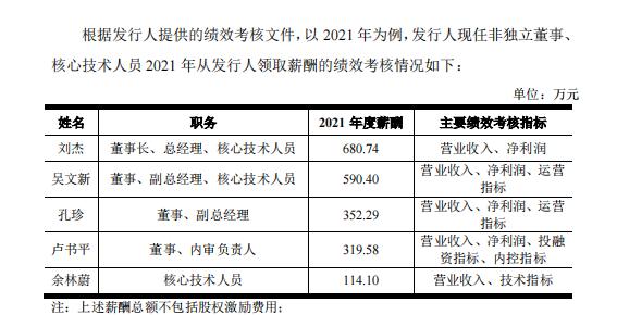 根据招股说明书显示,报告期内,发行人董事刘杰、吴文新、孔珍、卢书平2021年度薪酬分别为680.74万元、590.40万元、352.29万元、319.58万元。公司董事薪酬总额高达到1,943.01万元,是可比公司平均值2倍以上。
